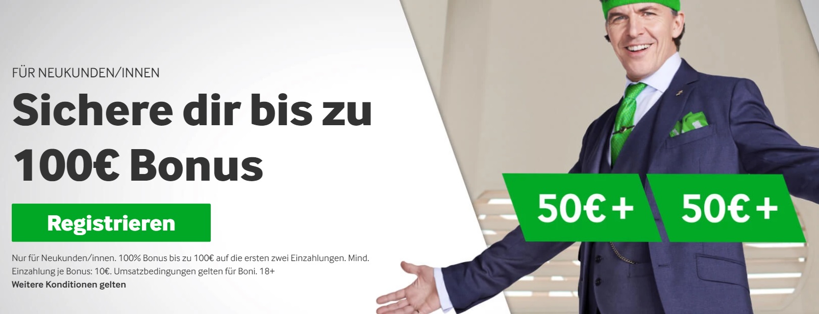 Der betway Bonus setzt sich aus zwei identischen Teilen zusammen. Los geht’s für Sie mit zwei 100%igen Einzahlungsprämien von bis zu 50 Euro. Ihr Wettkapital wird also im Idealfall jeweils von 50 Euro auf 100 Euro erhöht.