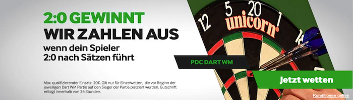 - Ausführliche Informationen zur Darts WM-Aktion „2:0 gewinnt – Wir zahlen aus“ finden Sie im Bereich „Angebote“.