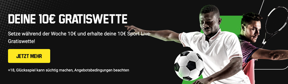 Im Anschluss – unabhängig von ihrem Gewinn oder vom Verlust – erhalten Sie sofort eine 10 € Live Freiwette gutgeschrieben. Der Gratis Tipp muss innerhalb von sieben Tagen eingelöst werden, ebenfalls bei freier Sportarten- und Event-Auswahl. Die Abrechnung erfolgt im typischen Gratiswetten-Schema. Der Einsatz bleibt bei Unibet, sie erhalten den Reingewinn, selbstverständlich ohne anschließende Umsatzbedingungen.