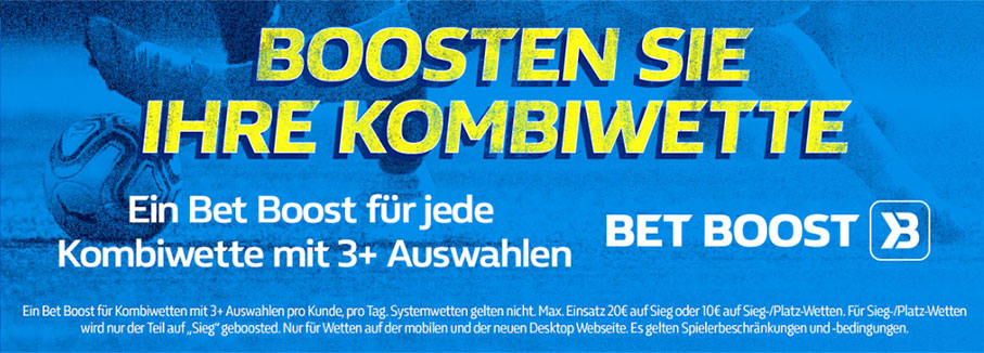 Des Weiteren können Sie beim Onlinebuchmacher einen täglichen Kombiwetten-Boost nutzen. Der Vorteil an dieser Stelle ist, dass Sie sich ihren Wettschein selbst nach Belieben zusammenstellen können. Sie sind nicht – wie bei den Mega Boost Offerten – an vorgegebene Sport-Ereignisse gebunden.