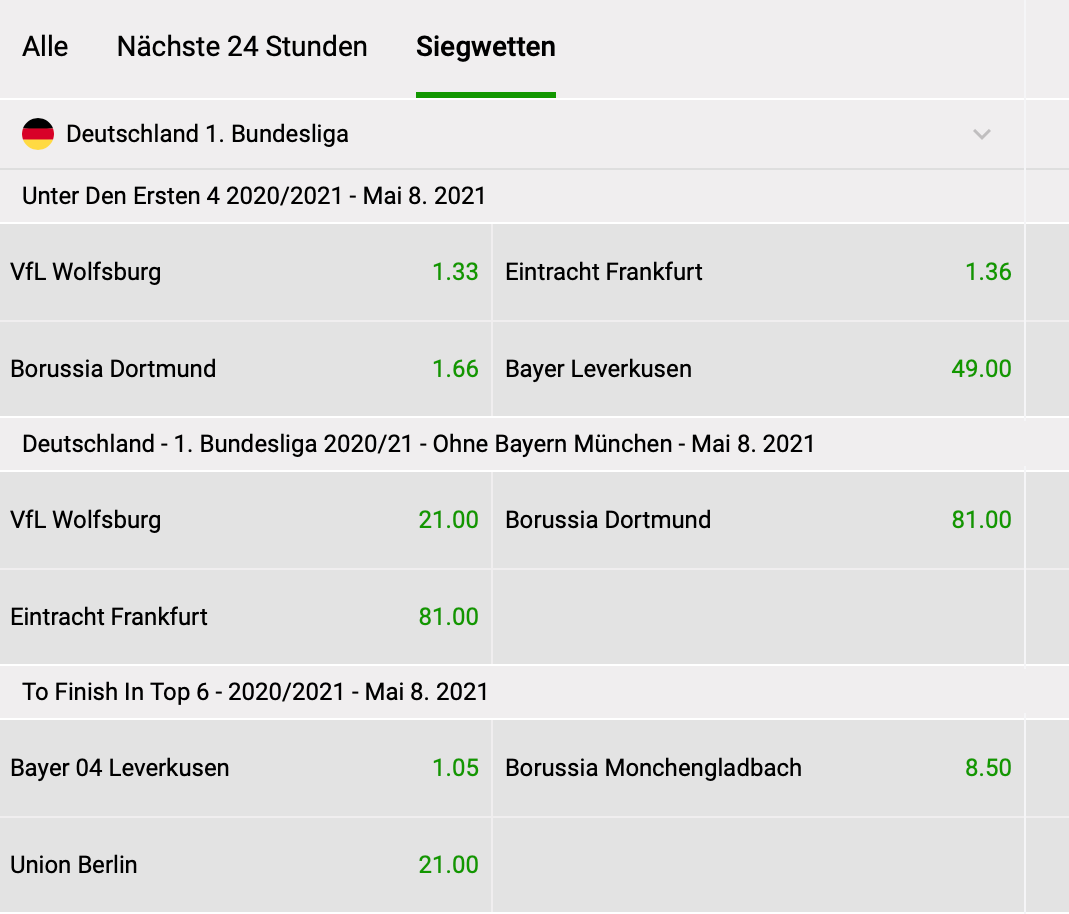Zodiac Bet hat für alle vier möglichen Champions League Teams der kommenden Spielzeit Wettquoten auf dem Bildschirm. Der Markt nennt sich „Wer kommt unter die ersten Vier“. Sie können folgende Fußball-Wetten für die abschließenden Bundesliga-Spieltage setzen: